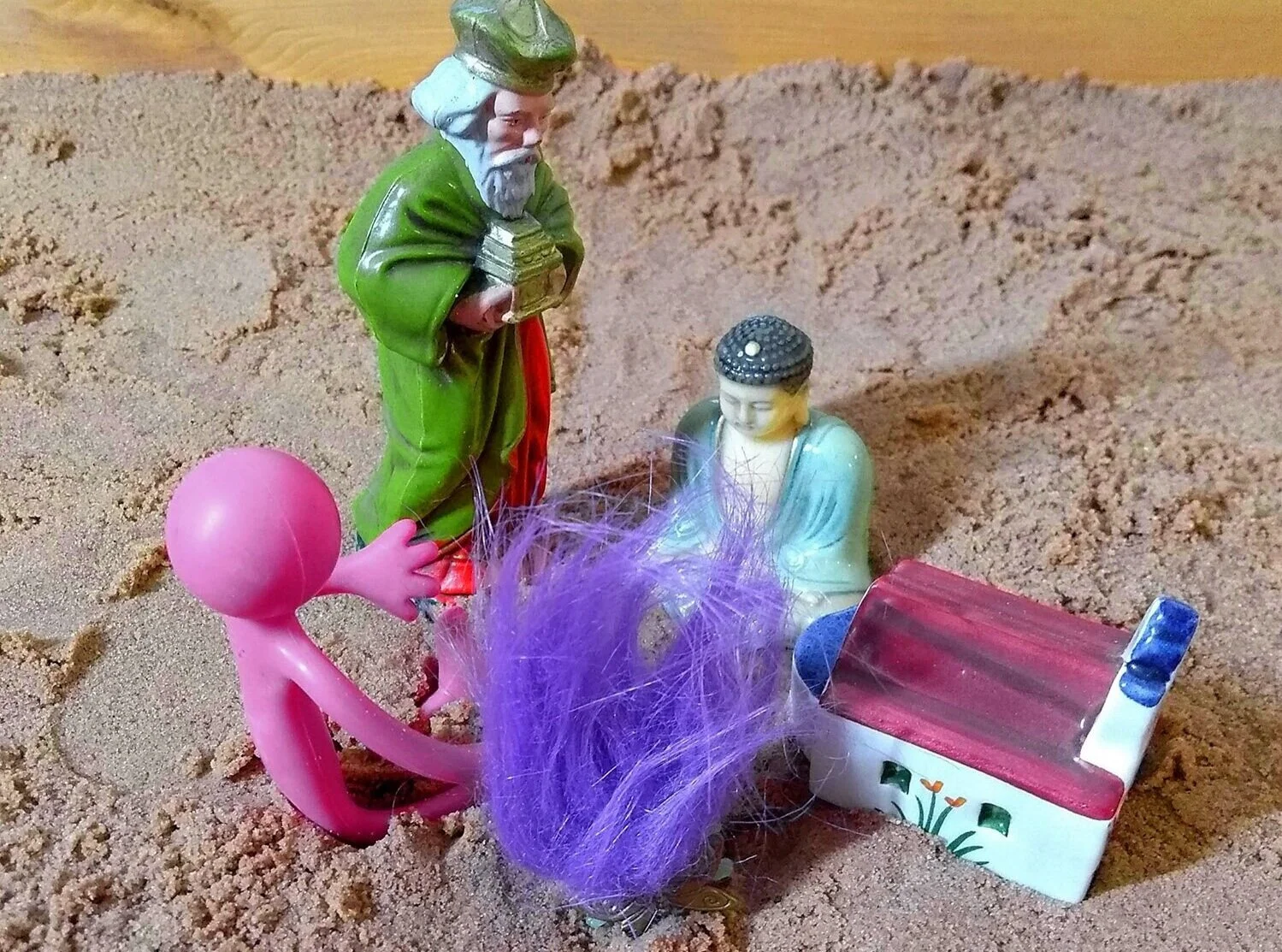 Sandtray can be used for working with traumatic experiences, resolving stuck feelings, discovering life purpose, working with the inner child, identifying the core mission of a business venture, creative projects such as designing a logo or breaking through writer’s block, and exploring spirituality. As with EFT, we don’t even need to work with you telling me what the issue is about. Sandtray is a great way for understanding your world, for looking at a repeating issue, at a dream, or just allowing your experience to manifest. It can make the invisible visible. Like other art forms, it can hold abstractions, because you’re not limited by words and concepts.